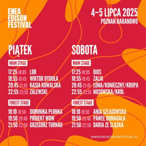 W gąszczu plenerowych imprez łatwo zapytać, czym Enea Edison Festival różni się od pozostałych wydarzeń i czym przyciąga. Czy to fakt, że na Main Stage i Forest Stage gra plejada polskich artystów, legend krajowej muzyki i debiutantów szturmem podbijających listy przebojów? A może to bliska odległość jeziora, która w upalne dni daje ukojenie? A może fakt, że piknikowa, niespieszna atmosfera festiwalu pozwala złapać oddech i na kilkanaście godzin wyrwać się z miasta? Jedno jest pewne – od 2018 roku festiwal gromadzi kilkutysięczną publiczność, która nazywa go najlepszą podpoznańską domówką.
