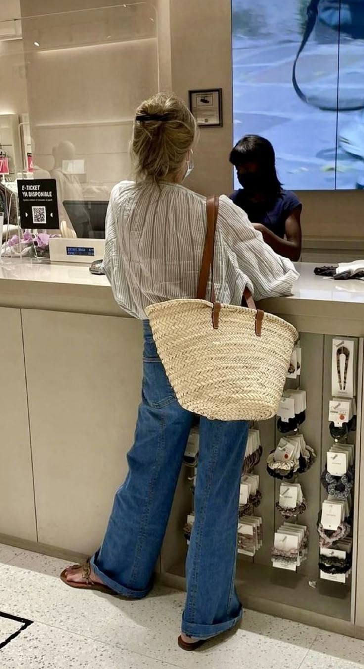 2. Torebka-koszyk, z którego wysypują się pomarańcze, książki, warzywa na zupę. Latem możesz zastąpić swoją płócienną torbę właśnie koszykiem, który pomieści wszystko, co potrzebne w ciągu dnia, na plaży czy na wycieczce. Long story short: kiedyś poszłam do babci na herbatę, coś sobie pogadałyśmy i ona nagle wyciąga z szafy koszyk, boski koszyk z długimi uszami, który bezwstydnie jej podkradłam i który bardzo długo mi służył. Można? Można. Teraz przyszedł czas wymienić go na taki, jaki sobie wymarzyłam: pojemny, jeszcze większy niż tamten, ale tym razem z krótkimi rączkami, z prostym i klasycznym splotem. A znalazłam go na Vinted, jeszcze bardziej bosko!