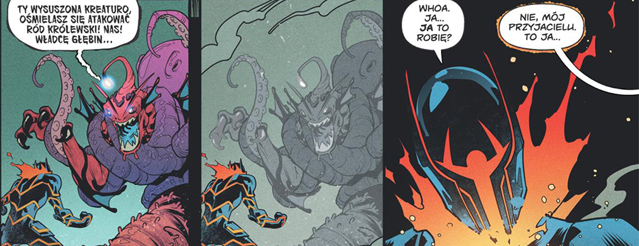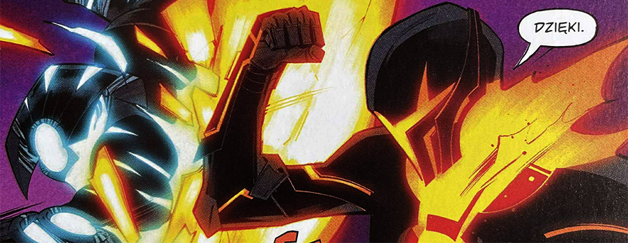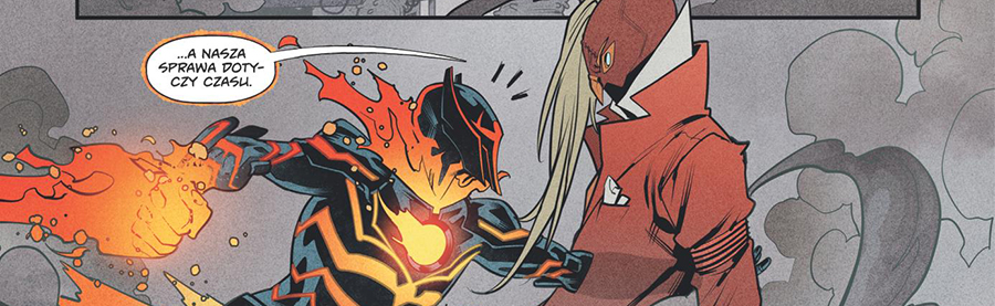 Scenarzysta Ryan Parrott ucieka od klasycznego superhero, stawiając na efektowną grę z odbiorcą. Już w pierwszym zeszycie protagonista spotyka watażkę, który manipuluje czasoprzestrzenią i za sprawą powieści paragrafowej… zamyka nas w pętli czasu (!). To rozwiązanie naprawdę mnie zaskoczyło. Rozpracowanie tej pułapki, w którą razem z nim wpadłem jako czytelnik, zajęło mi dobrych kilka minut!