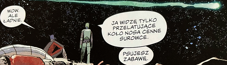 Mamy tu moralnie niejednoznaczny świat. (Przypadkowo spotkany pirat okazuje się całkiem spoko, gdy tylko sam znajduje korzyść w udzielanej pomocy). Do tego przebłyski z innych części kosmosu dowodzą, że to czego doświadczamy jest tylko fragmentem większego pola zdarzeń. Forma jest lekka, wciągająca i przystępna. Wszystko podane w doborowej oprawie Lorenzo De Feliciego.